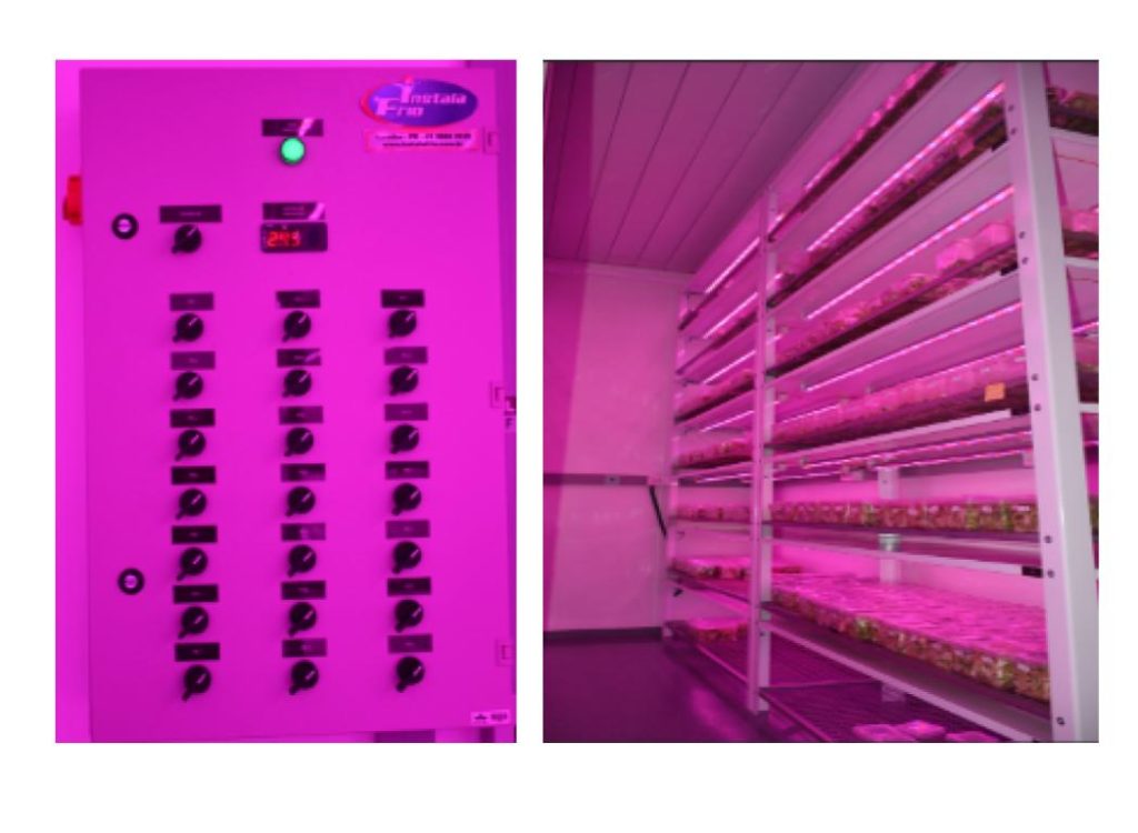 Iluminação: Sistema de iluminação por LED de espectro adequado ao crescimento vegetal PAR (radiação fotossinteticamnte ativa), distribuído uniformemente nas prateleiras. O fotoperíodo é totalmente ajustável conforme o protocolo experimental.